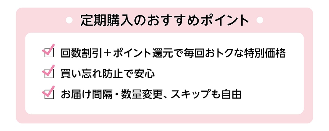 買い忘れの心配がなく、通常の定期購入の回数割引と合わせて、さらにお得に継続いただけます。