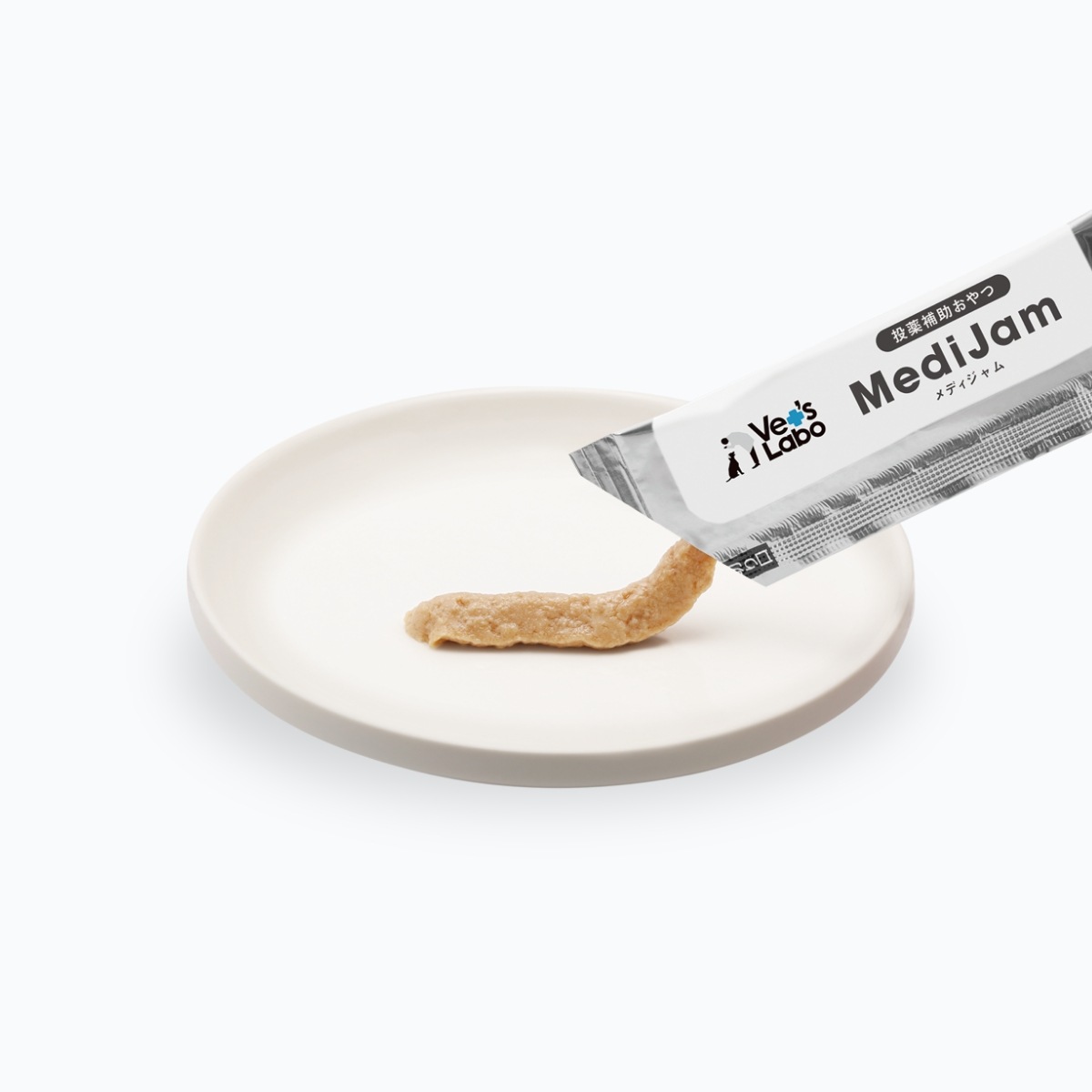 メディジャムは粉薬や、何かに包み込んでお薬を食べることが苦手なワンちゃんのために臨床獣医師が質感と素材を追求して開発したグレインフリーの投薬補助用おやつです。