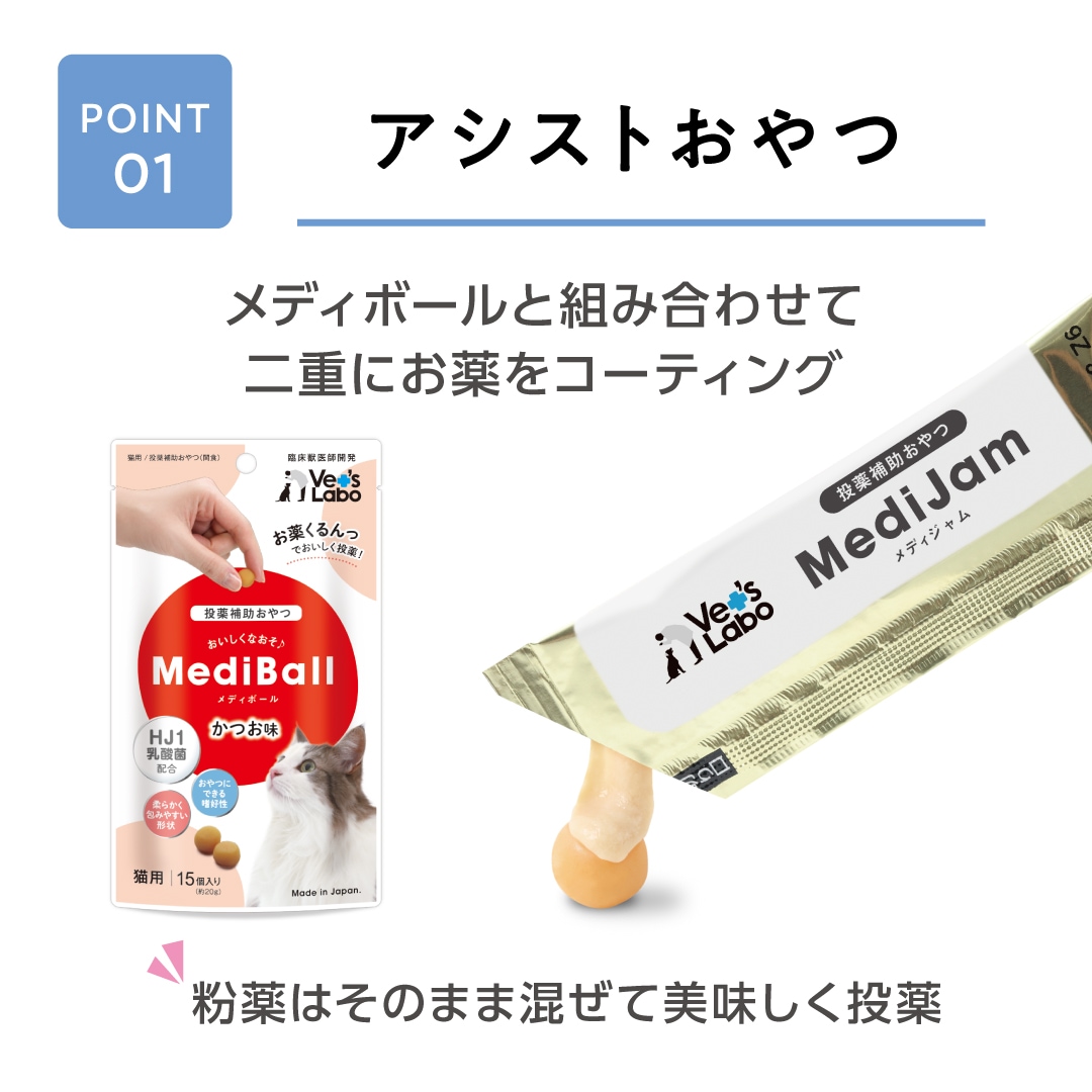 メディジャムは粉薬や、何かに包み込んでお薬を食べることが苦手なネコちゃんのために臨床獣医師が質感と素材を追求して開発したグレインフリーの投薬補助用おやつです。