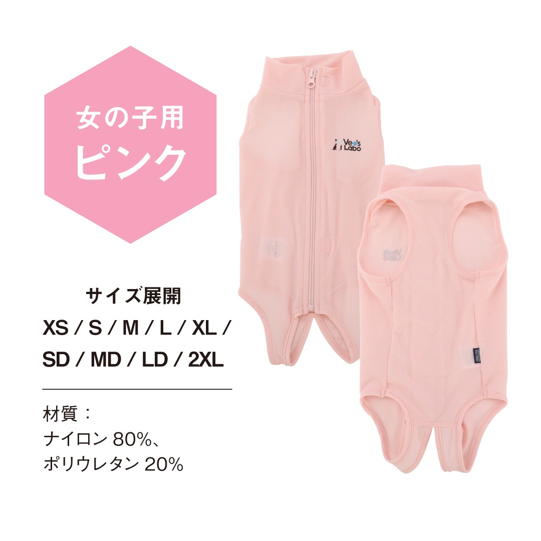 - 術後衣としてだけでなく、換毛期の抜け毛やノミ・ダニ対策など、普段着としても着用いただけるようにスタイリッシュなデザインに。犬・猫用のファッションブランド「MANDARINE BROTHERS」との共同開発にて実現しました。女の子用はピンク、男の子用はカーキとそれぞれ設計を変えて作成しているため、着用したまま排泄が可能です。