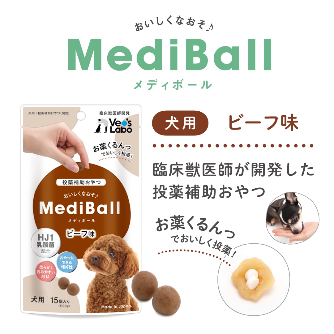 メディボールはお薬が苦手なワンちゃんのために臨床獣医師が開発した投薬補助用のおやつです。