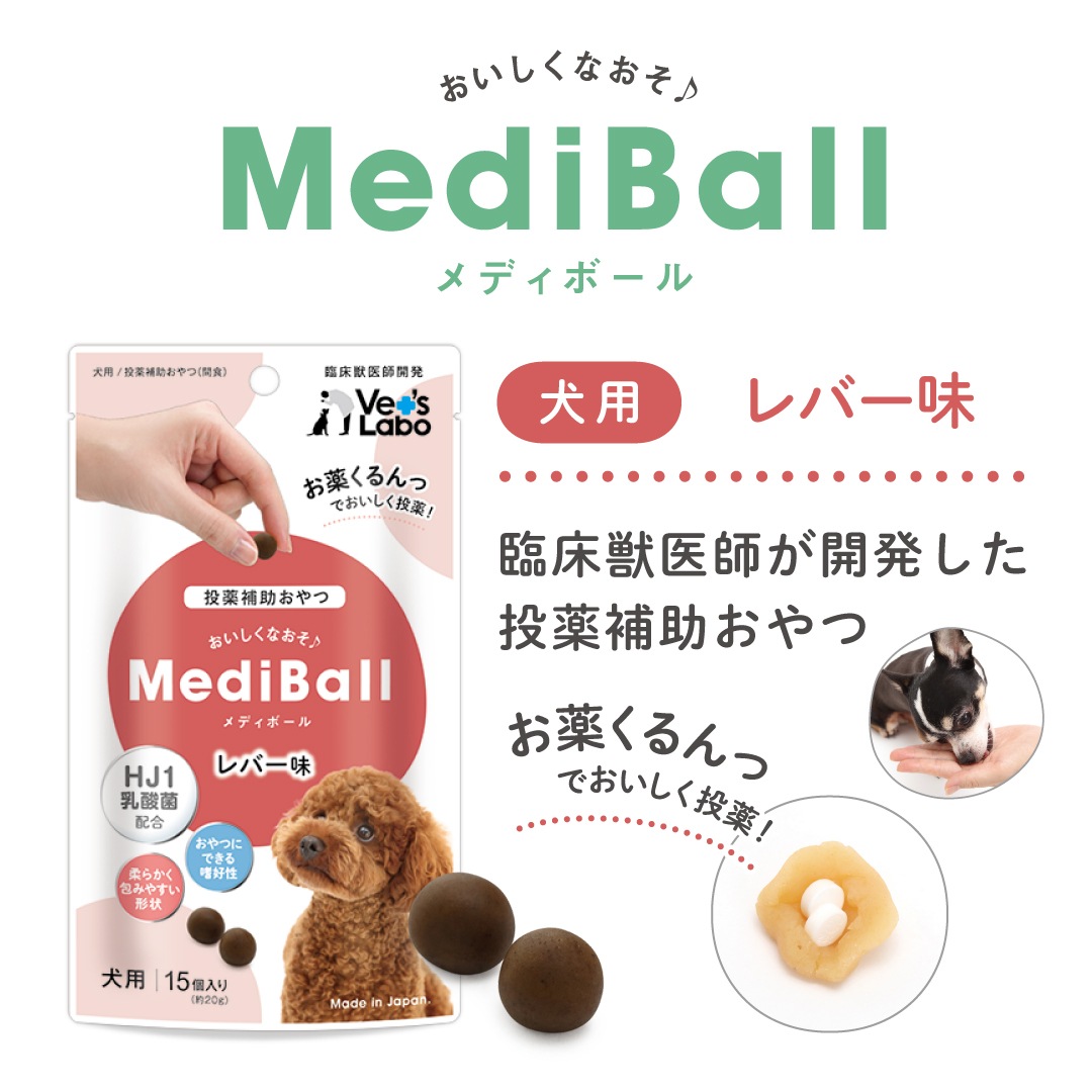メディボールはお薬が苦手なワンちゃんのために臨床獣医師が開発した投薬補助用のおやつです。