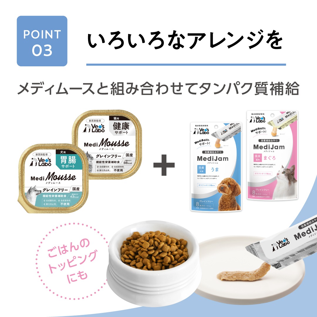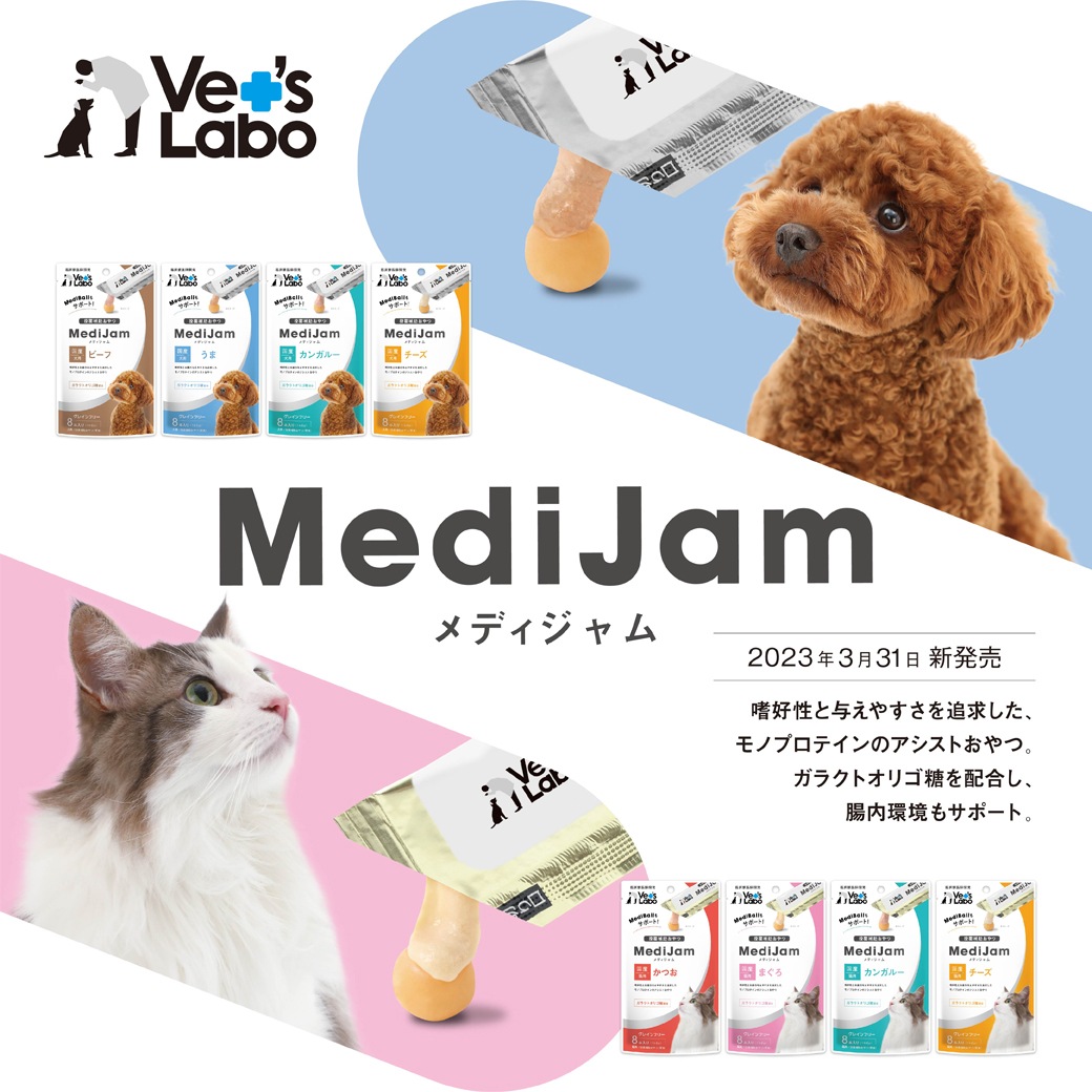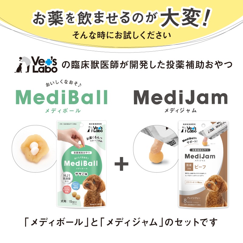 Vet's Laboの臨床獣医師が開発した投薬補助おやつ「メディボール」と「メディジャム」のセットです。