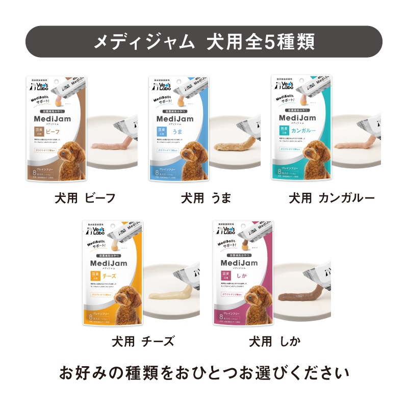 メディジャムは粉薬や、何かに包み込んでお薬を食べることが苦手なワンちゃんのために臨床獣医師が質感と素材を追求して開発したグレインフリーの投薬補助用おやつです。
