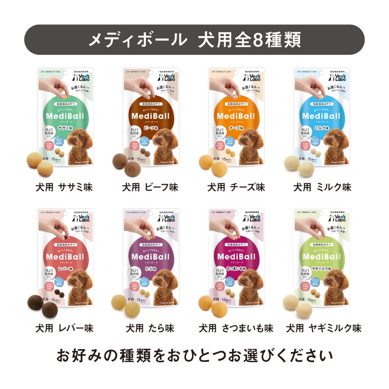 ペットにとっても、ペットオーナーにとってもストレスとなる投薬。処方された薬をメディボールに包み込んで与えることで、隠された薬に気付かずに食べてくれます。与えやすく飽きにくい美味しさに、臨床獣医師がこだわって開発した投薬補助おやつです。