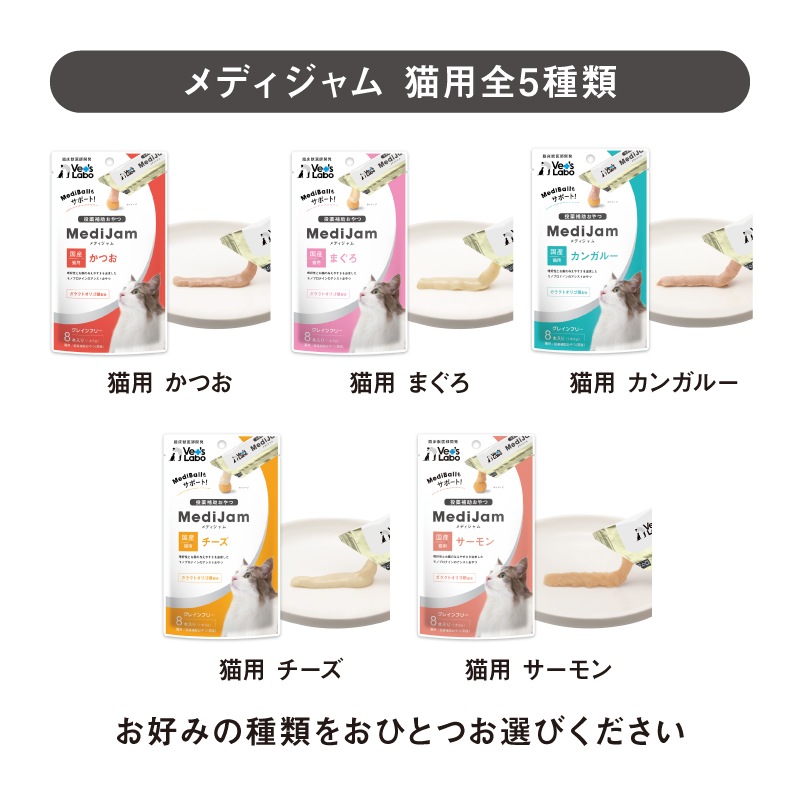 メディジャムは粉薬や、何かに包み込んでお薬を食べることが苦手なネコちゃんのために臨床獣医師が質感と素材を追求して開発したグレインフリーの投薬補助用おやつです。