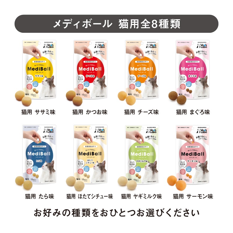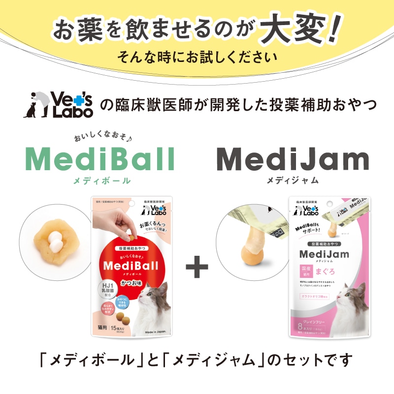 Vet's Laboの臨床獣医師が開発した投薬補助おやつ「メディボール」と「メディジャム」のセットです。