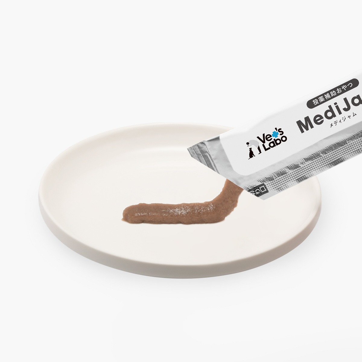 メディジャムは粉薬や、何かに包み込んでお薬を食べることが苦手なワンちゃんのために臨床獣医師が質感と素材を追求して開発したグレインフリーの投薬補助用おやつです。