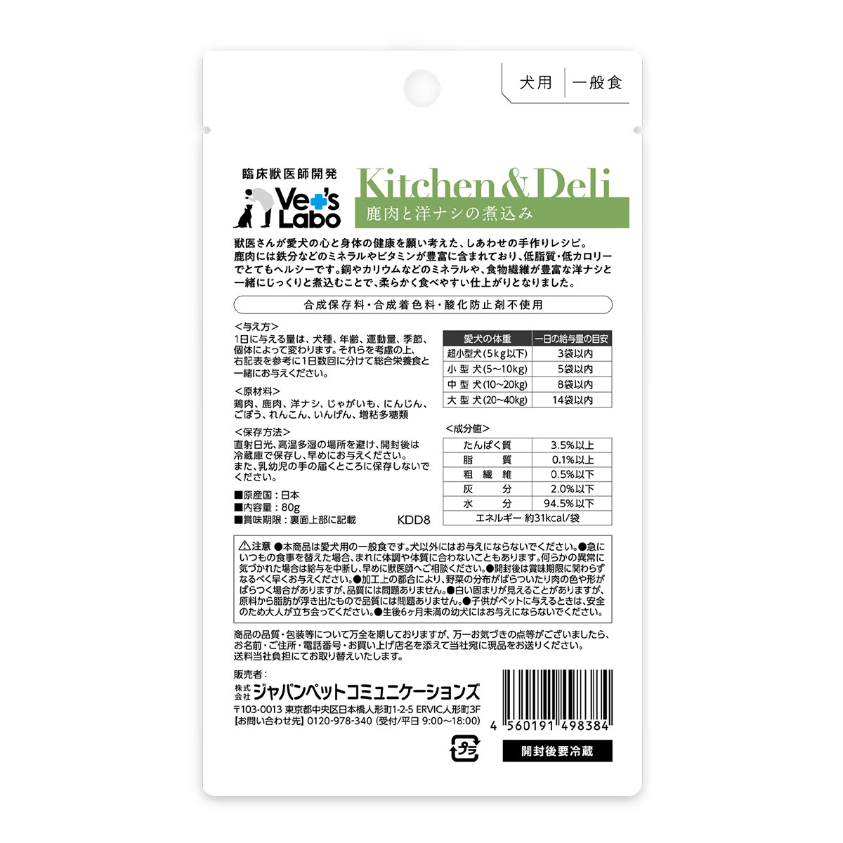 | 原材料 | 鶏肉、鹿肉、洋ナシ、じゃがいも、にんじん、ごぼう、れんこん、いんげん、増粘多糖類 |