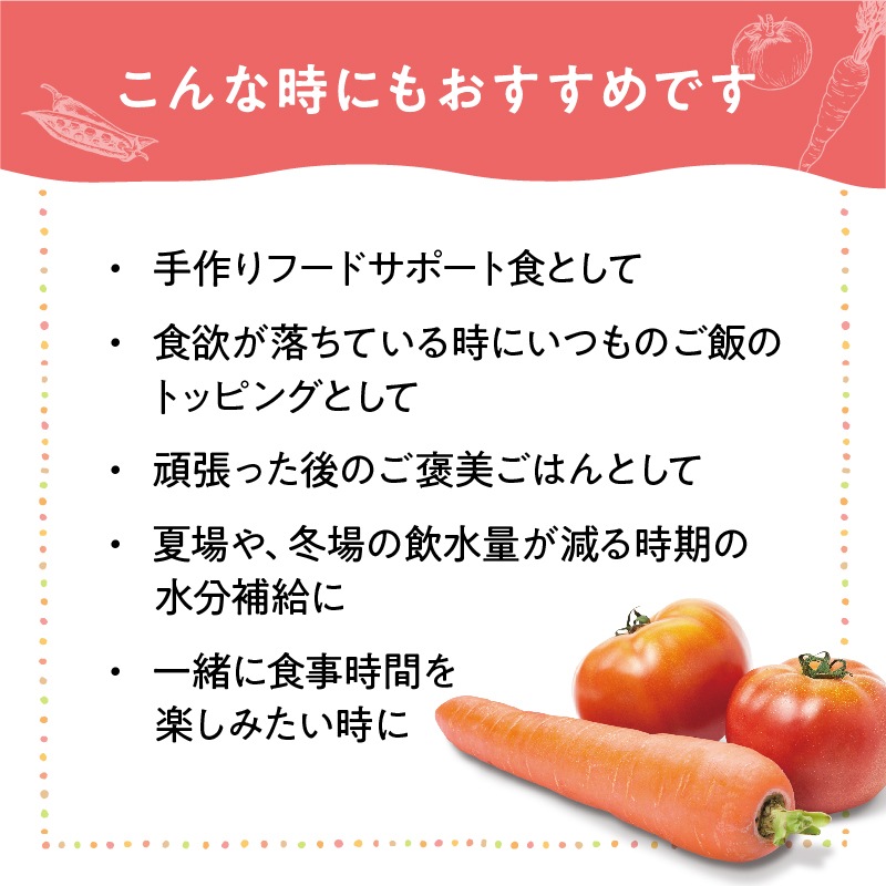 - ※急にいつもの食事を替えた場合、まれに体調や体質に合わないこともあります。何らかの異常に気づかれた場合は給与を中断し、早めに獣医師へご相談ください。