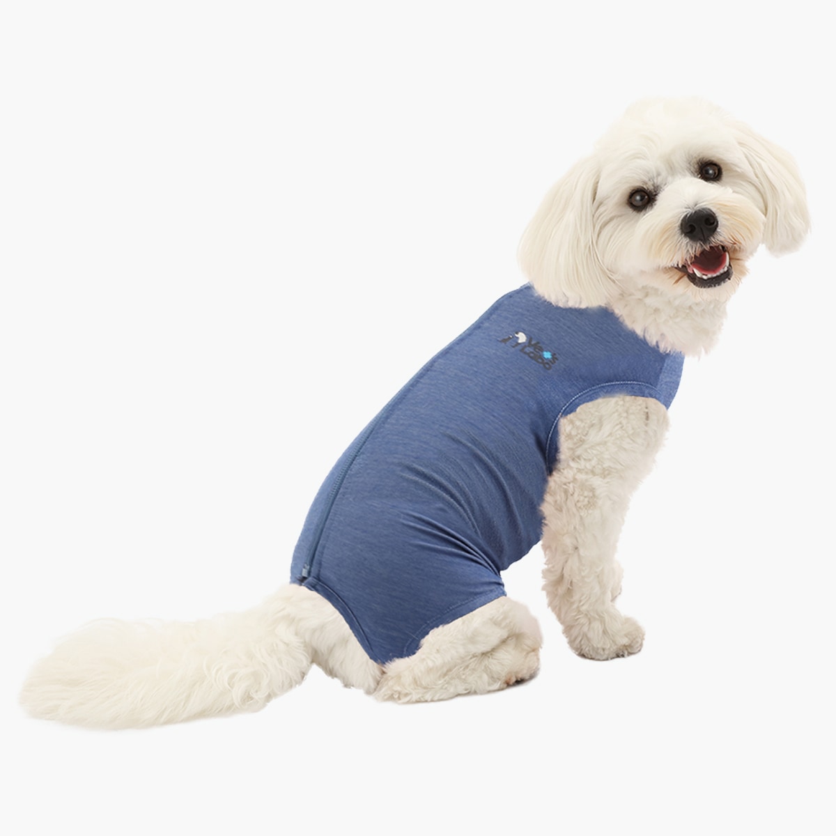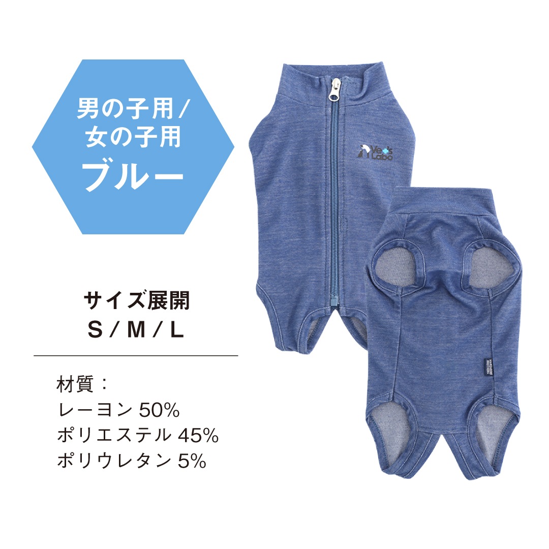 - 生地は伸縮性のあるおしゃれなデニム生地を採用しました。薄手で柔らかなデニム生地のため、ワンちゃんの皮膚に負担をかけずに患部をしっかり保護でき手術後も安心してご着用いただけます。