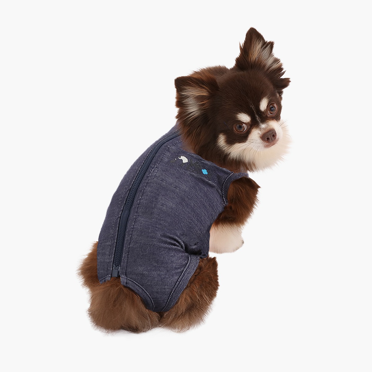 - 生地は伸縮性のあるおしゃれなデニム生地を採用しました。薄手で柔らかなデニム生地のため、ワンちゃんの皮膚に負担をかけずに患部をしっかり保護でき手術後も安心してご着用いただけます。
