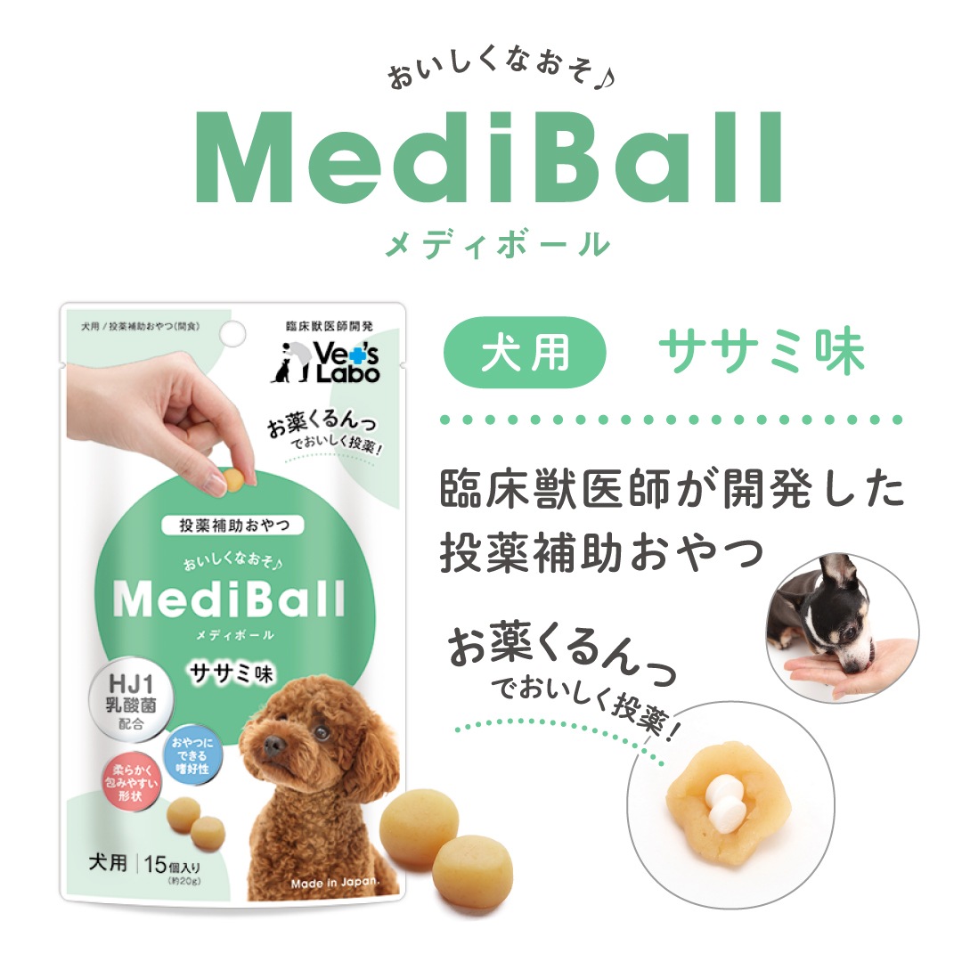 メディボールはお薬が苦手なワンちゃんのために臨床獣医師が開発した投薬補助用のおやつです。