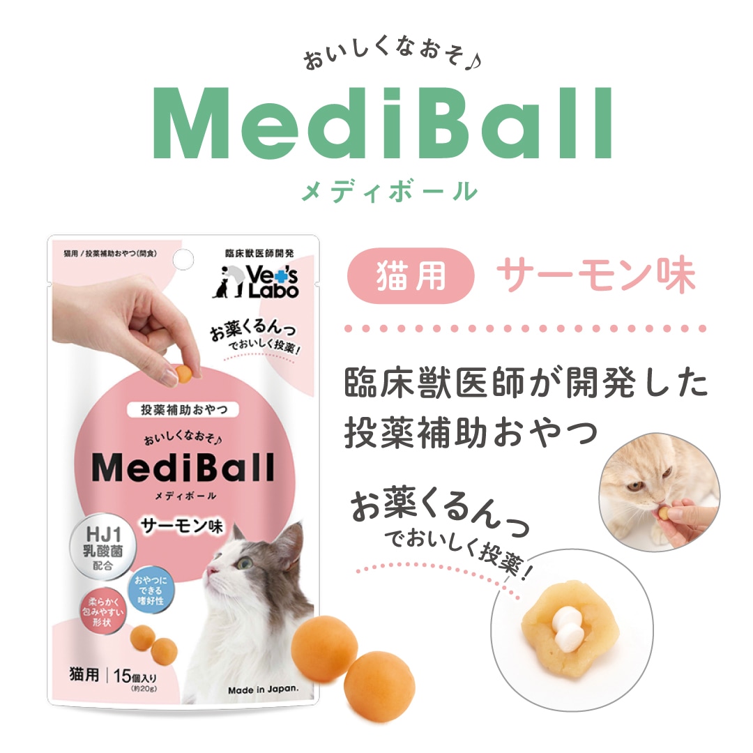 メディボールはお薬が苦手なネコちゃんのために臨床獣医師が開発した投薬補助用のおやつです。