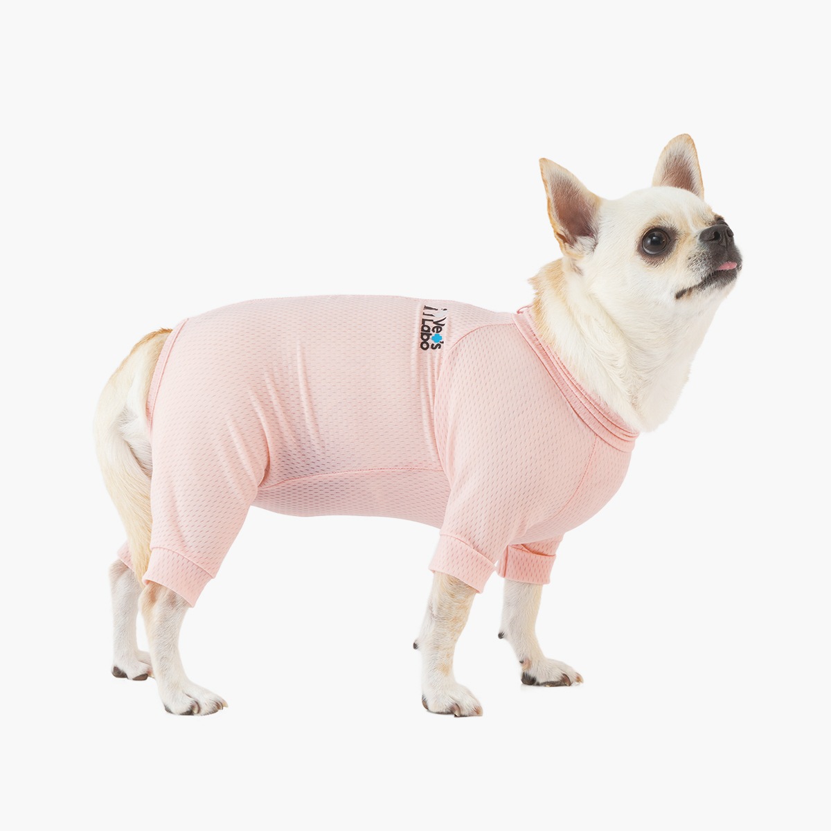 - 首からお尻まで全身を包み込み、デリケートな皮膚を守ってくれます。脇や鼠径部などの皮膚が薄くて傷つきやすい部分を保護できるだけでなく、お散歩中の草や虫との接触による皮膚トラブルを避けるのにも役立ちます。