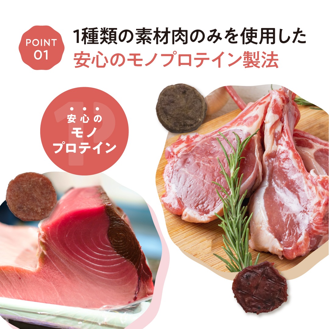 - 1種類の素材肉のみを使用した安心のモノプロテイン製法